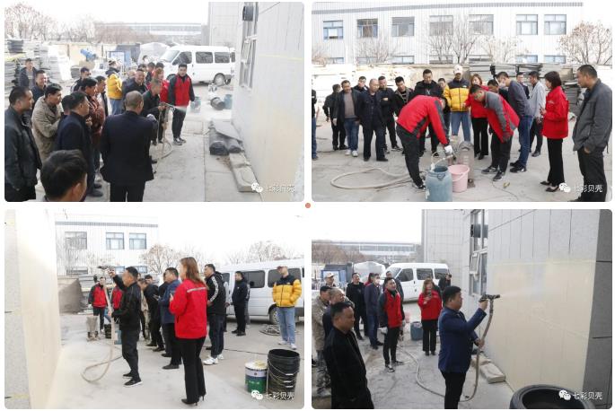 培訓現場,七彩貝殼集團以集團的SG-6人工智能噴涂機、SG-9大流量砂漿噴涂機為例,向現場的工人進行了真石漆、保溫顆粒的噴涂演示,并就機器的基本操作問題進行了詳細的講解,現場的工人紛紛進行現場操作,并對機器的噴涂效率、機器的智能化水平給予了充分肯定。